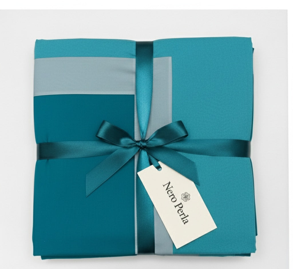 Il percalle è considerato uno dei tessuti più pregiati per la biancheria da letto di lusso. La sua trama fitta e regolare garantisce una superficie liscia e setosa, resistente all'usura e sempre elegante. La balza decorativa con contrasto acqua marina aggiunge personalità e stile, trasformando la tua camera in un ambiente raffinato e accogliente.