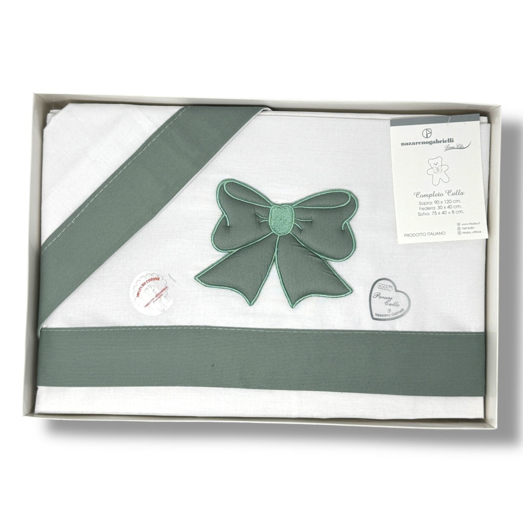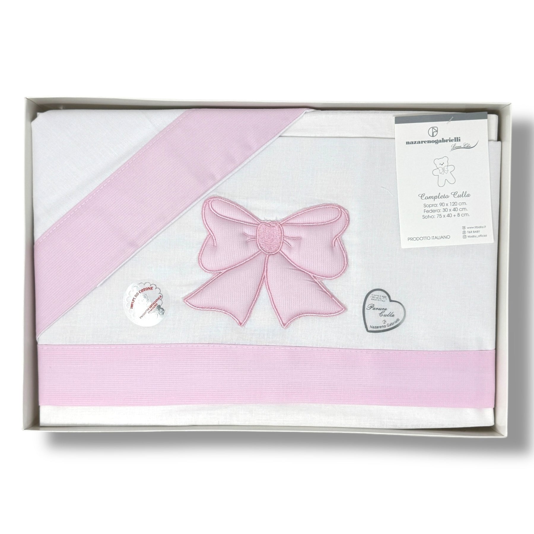 Nazareno Gabrielli Completo Lenzuola Carrozzina 3 Pezzi Con Ricamo Fiocco 90x120 100% Cotone Art. Ng95
