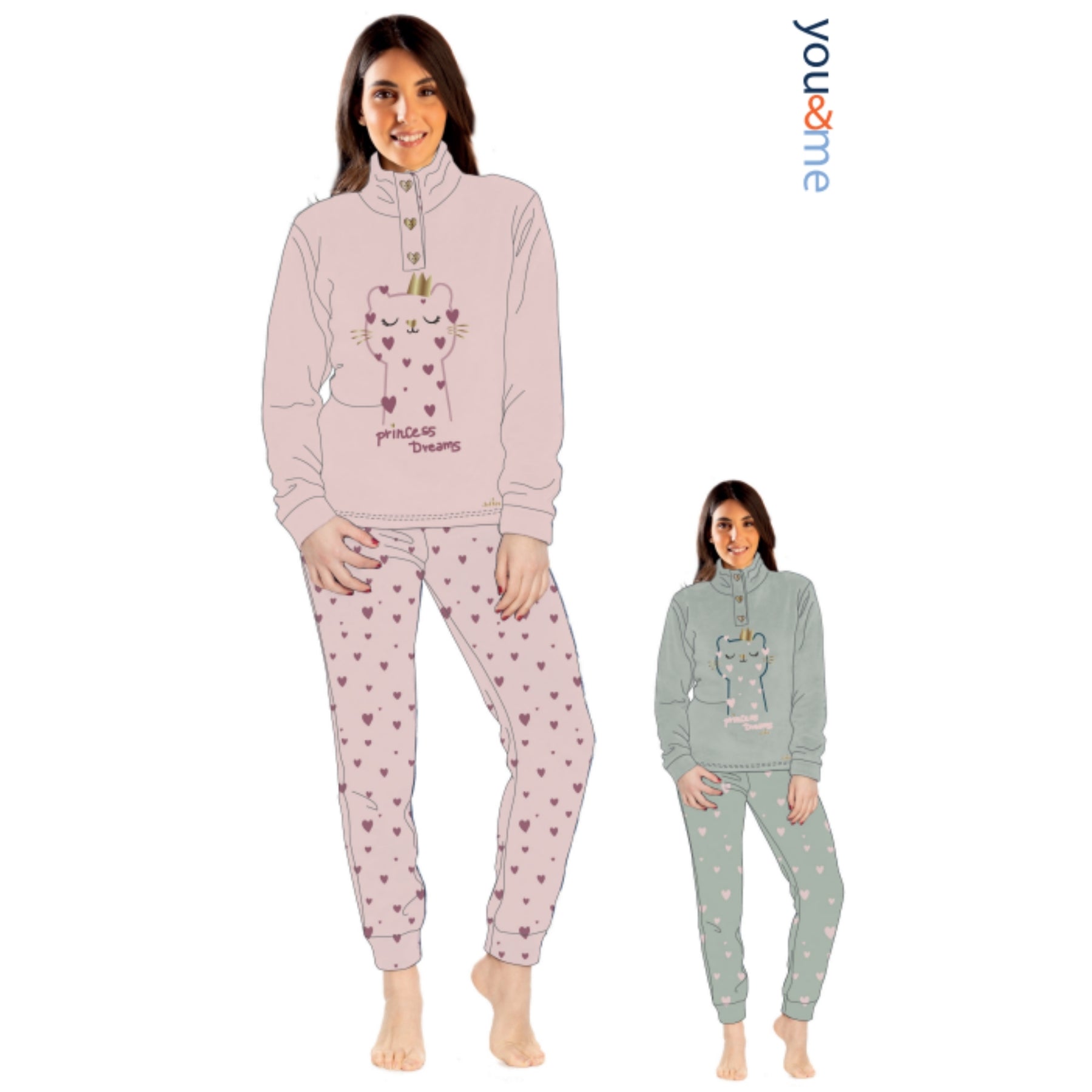 You&me Donna Coral Pigiama Donna Serafino In Soffice Coral Con Pantalone Stampato Art. Ymc729